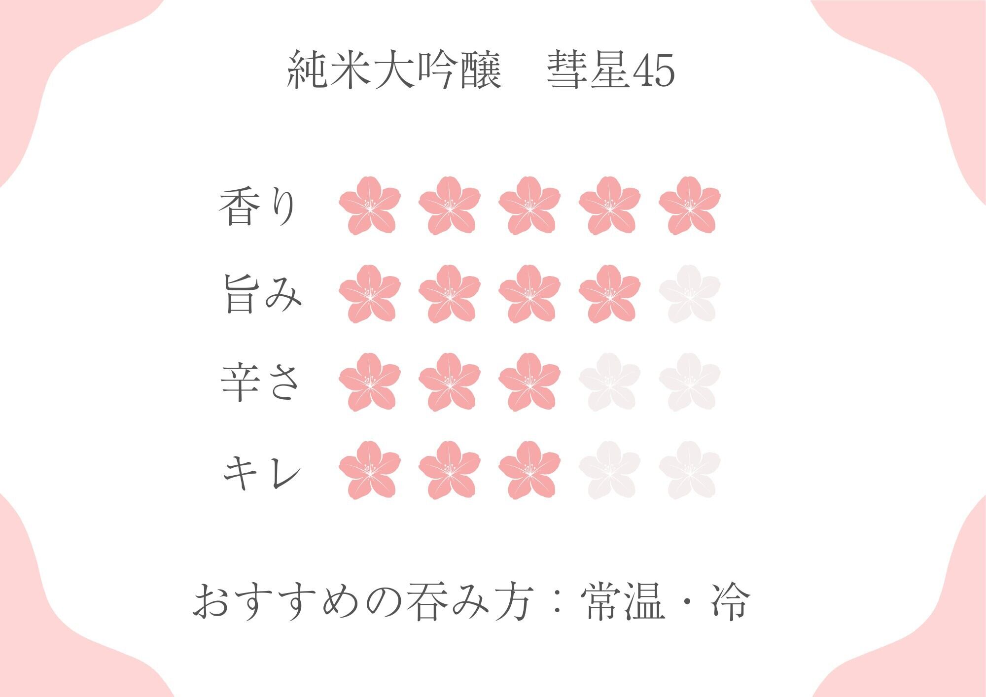 東川町産彗星45%磨き。フルーティーな香りと甘味酸味のバランスがよいお酒です。のど越しが柔らかく、和食など優しいお食事によく合います。甘口のお酒です。