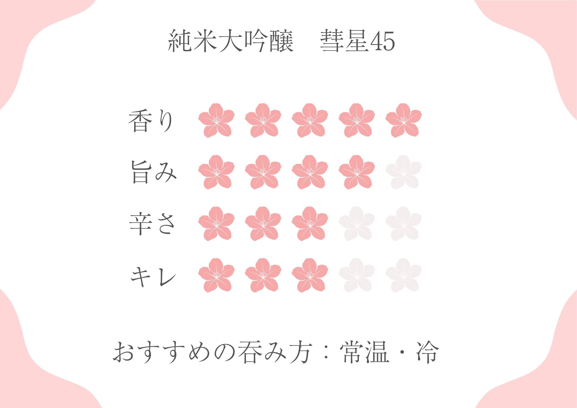 東川町産彗星45%磨き。フルーティーな香りと甘味酸味のバランスがよいお酒です。のど越しが柔らかく、和食など優しいお食事によく合います。甘口のお酒です。