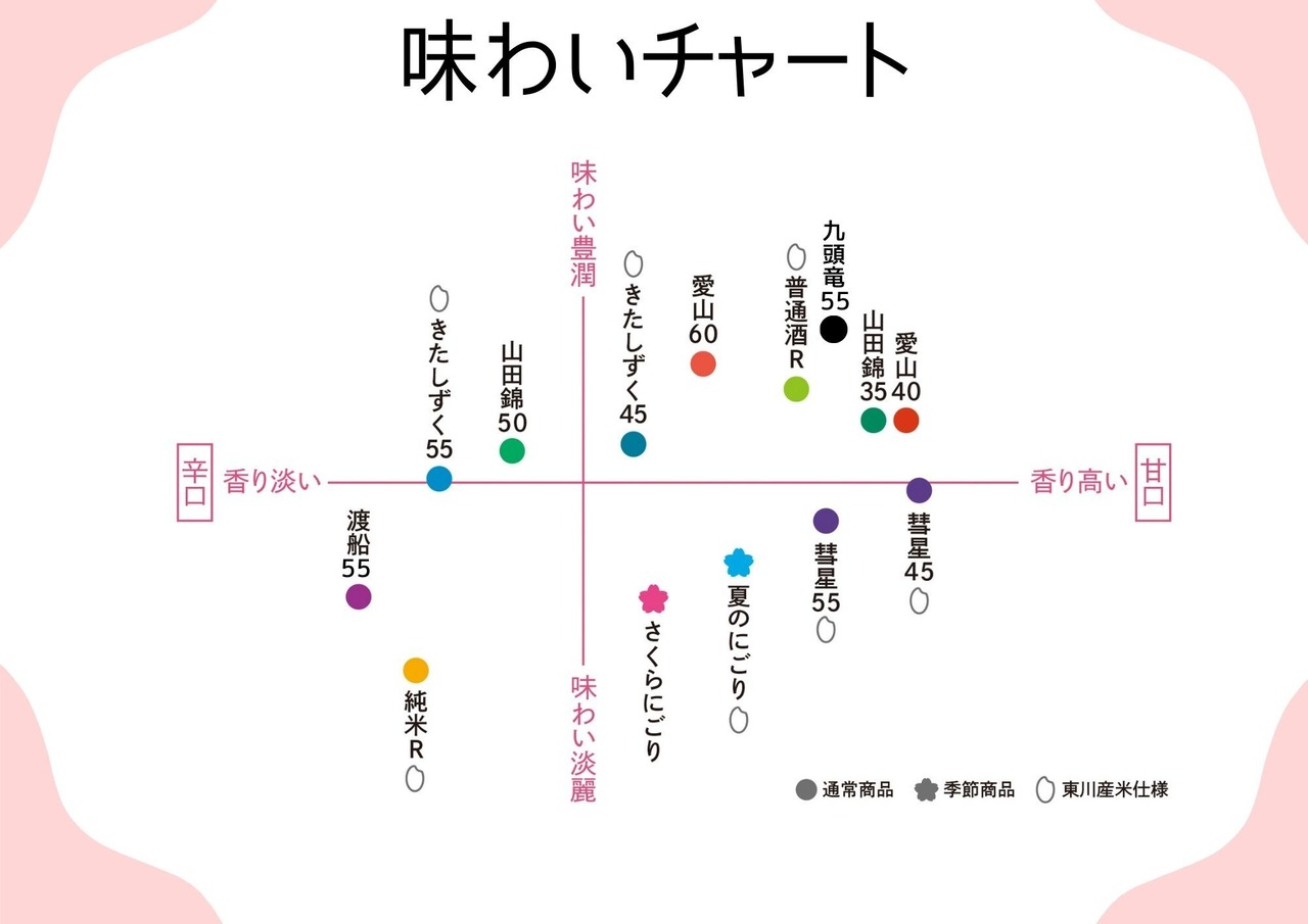 福井県産九頭竜を55%まで磨き、香り高く柔らかな酸味、上品な甘みとしっかりとした旨味で後味辛口スッキリの純米吟醸に仕上げました。